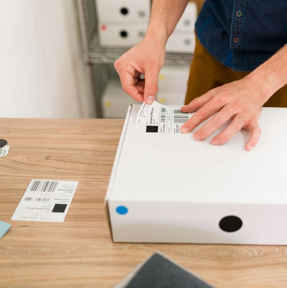 • Mocny klej: Etykiety trwale przylegają do kartonów, folii i opakowań transportowych.