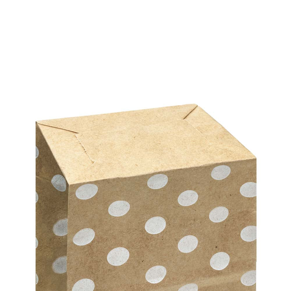 Papírový sáček 80x65x190mm s puntíky hnědý Je doobjednaný a bude odeslán, jakmile bude opět skladem.