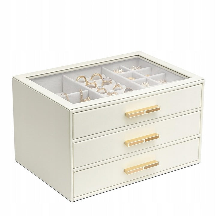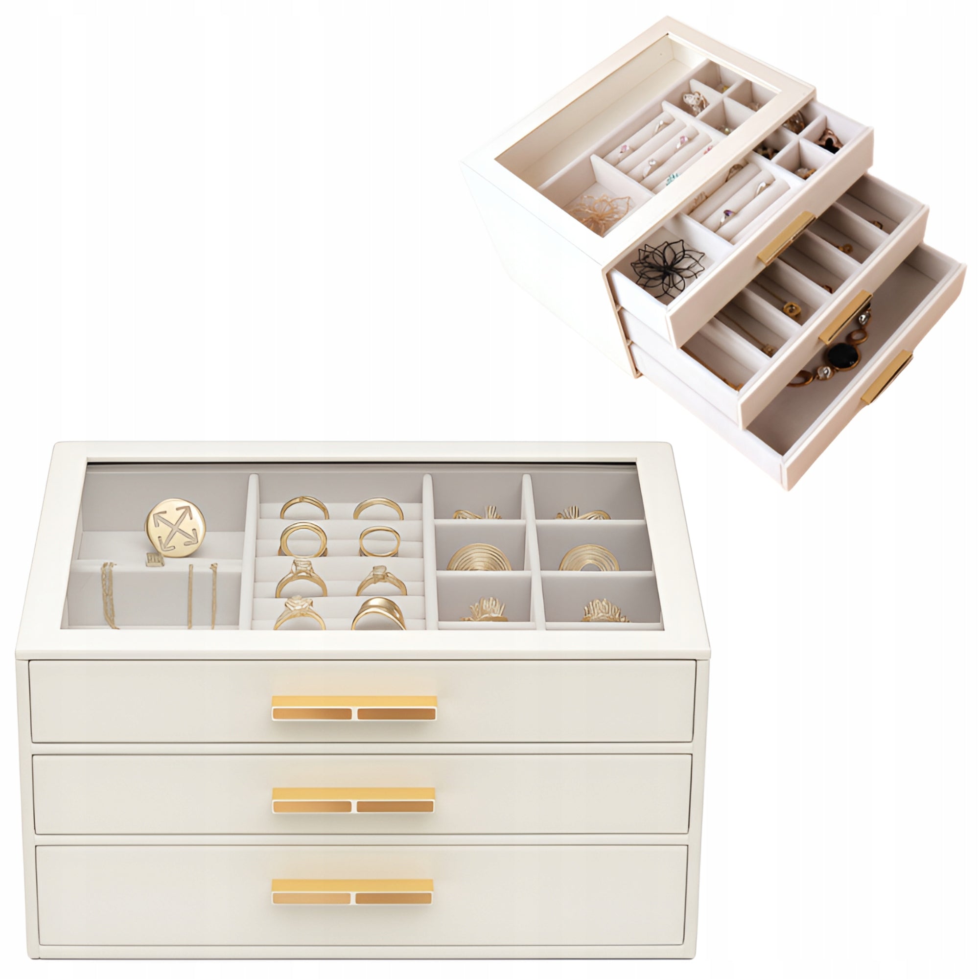 Krémová šperkovnice se zlatými detaily. Uspořádejte prsteny, náušnice, řetízky a hodinky v jedné krabičce a ochraňte je měkkou podšívkou. Zvolte eleganci a funkčnost na svém toaletním stolku!