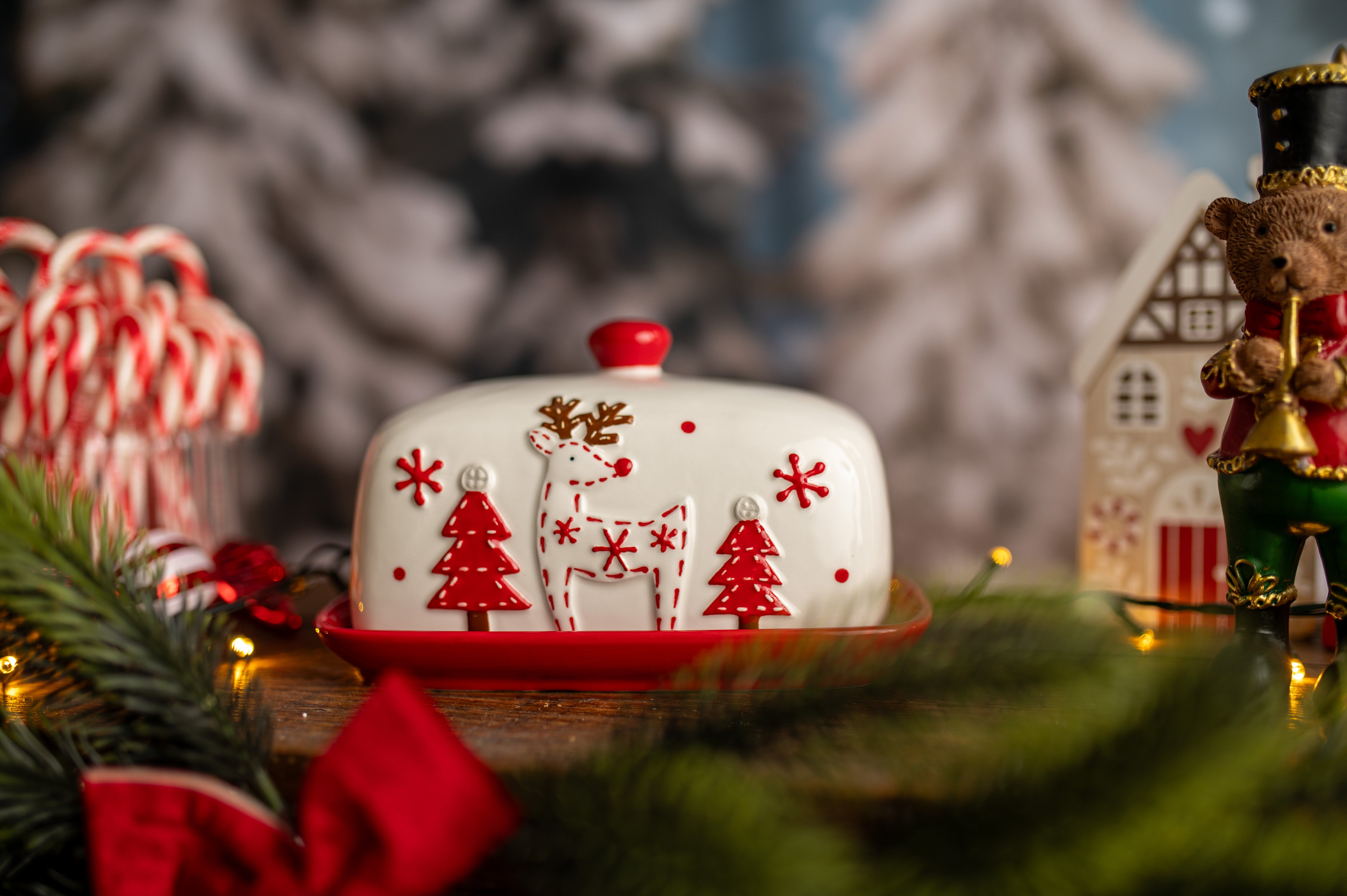 Vyberte si sváteční keramickou misku na máslo s víkem . Tato elegantní miska na máslo má motiv soba a vánočního stromečku. Udržte si máslo čerstvé a krásně prezentované po celou sezónu.