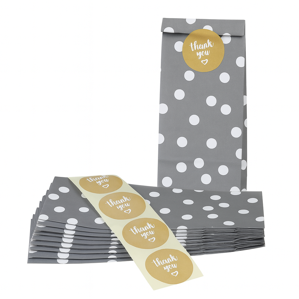Papírová taška 100x65x260mm s puntíky, šedá + zlaté samolepky s poděkováním