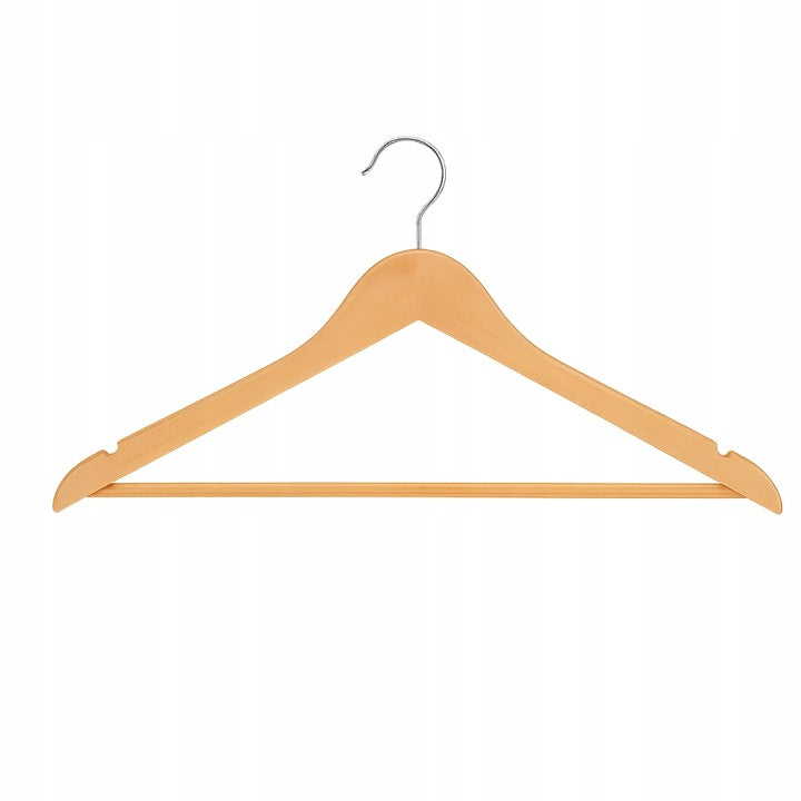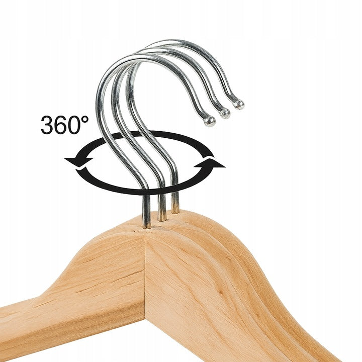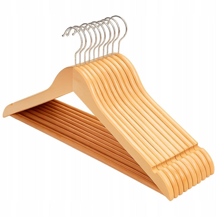 Order this set of 10 wooden hangers, 43 x 21 cm, with a 360° swivel hook , a trouser bar , and notches for straps. Perfect for wardrobes, dressing rooms, and boutiques . Durable, elegant, and non-slip, they'll keep coats, jackets, and shirts wrinkle-free.