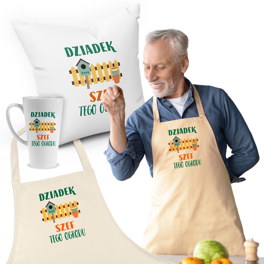 The Grandparents' Day gift set is a great way to express love and respect for this special person. The set includes three functional and warm elements: an apron, a mug and a pillow. An apron with a funny inscription or motif, perfect for a grandpa who is passionate about cooking, makes preparing meals even more enjoyable. A mug with a personal touch is a great way to relax with your favorite drink, and a soft pillow will provide comfort during rest. The whole is a thoughtful, practical and affectionate gift that will surely bring joy to your grandpa.