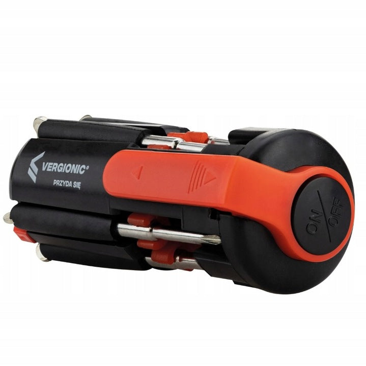 Set : The set includes 8 different bits - 4 flat bits and 4 Phillips bits , which are responsible for most standard screws used in everyday applications. Additionally, the screwdriver is equipped with an LED flashlight, which provides very good illumination when working in hard-to-reach places or in the absence of light. The flashlight is powered by 3 AAA batteries (not included) .