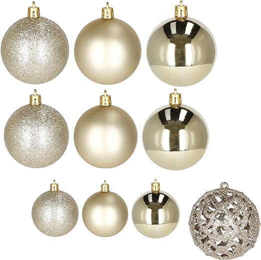 - Różnorodne wykończenia: W zestawie znajdują się bombki o różnych teksturach. Matowe, błyszczące oraz ażurowe, które razem tworzą efektowne dekoracje