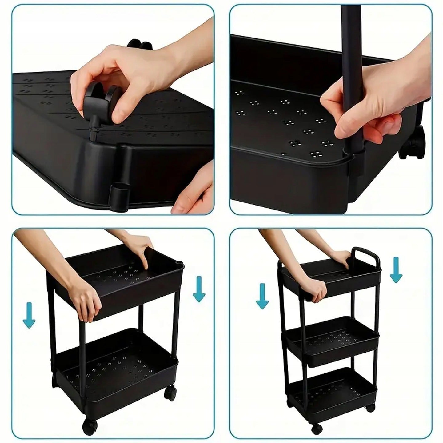 Wykonany z mocnego tworzywa sztucznego odpornego na wilgoć, jest trwały i odporny na codzienne użytkowanie. Dzięki obrotowym kółkom o 360 stopni, regał jest bardzo mobilny i można go łatwo przemieszczać w dowolne miejsce. Posiada cztery półki, które umożliwiają uporządkowanie różnych przedmiotów, takich jak kosmetyki, detergenty, zabawki, akcesoria kuchenne czy rośliny.