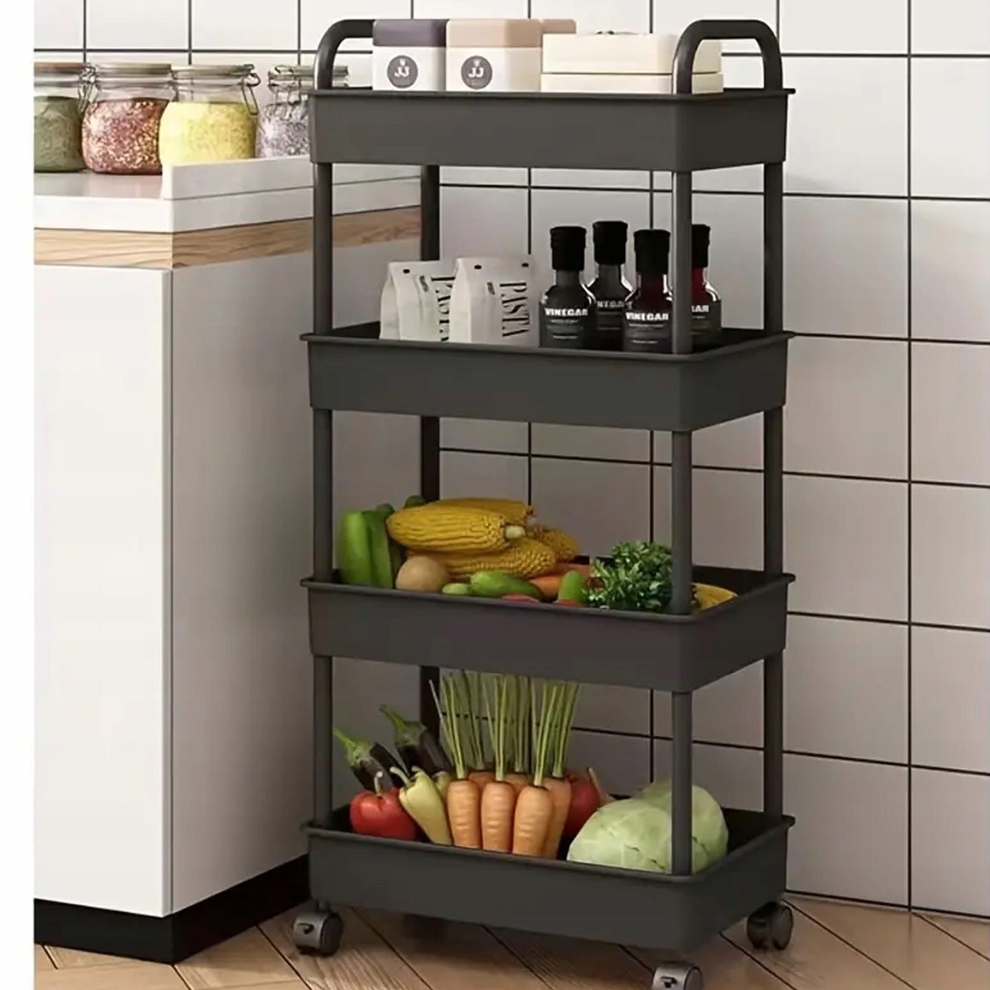 - Duża pojemność: Cztery półki do przechowywania różnych przedmiotów.