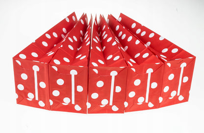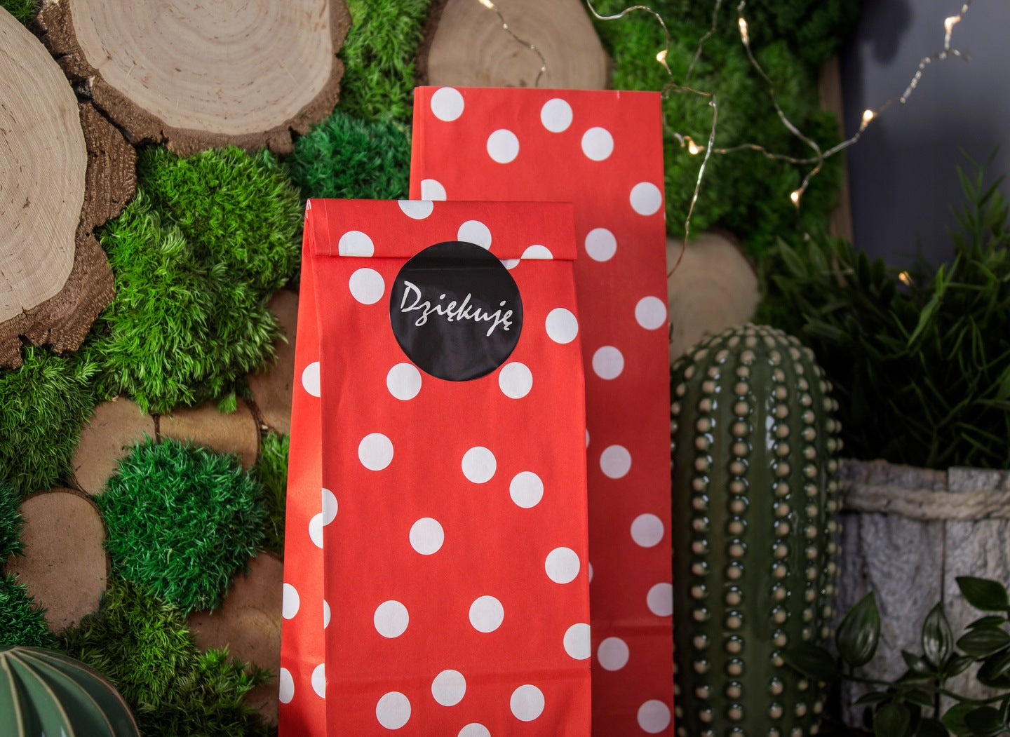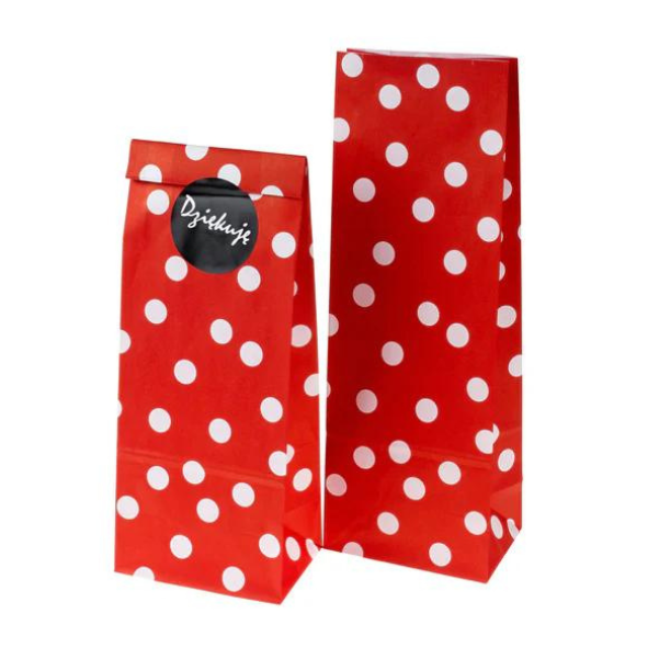 Wysoka jakość: Torby zostały wykonane z wysokiej klasy papieru - 70g/m2. Posiadają czerwony kolor oraz uroczę białe groszki. Do zestawu zostały dołączone naklejki z napisem "Dziękuję". Idealnie nadają się do pakowania słodyczy lub przedmiotów o mniejszych rozmiarach.
