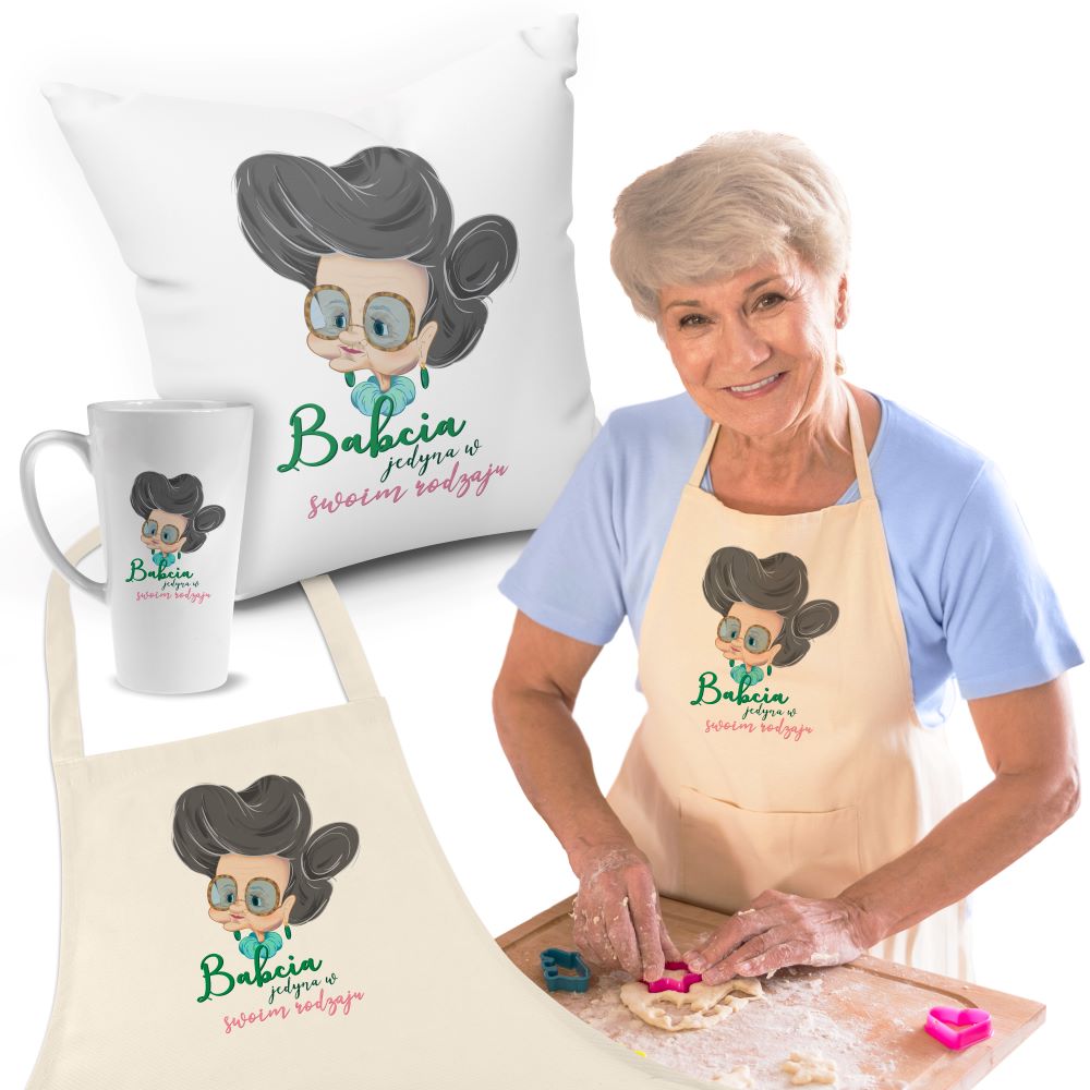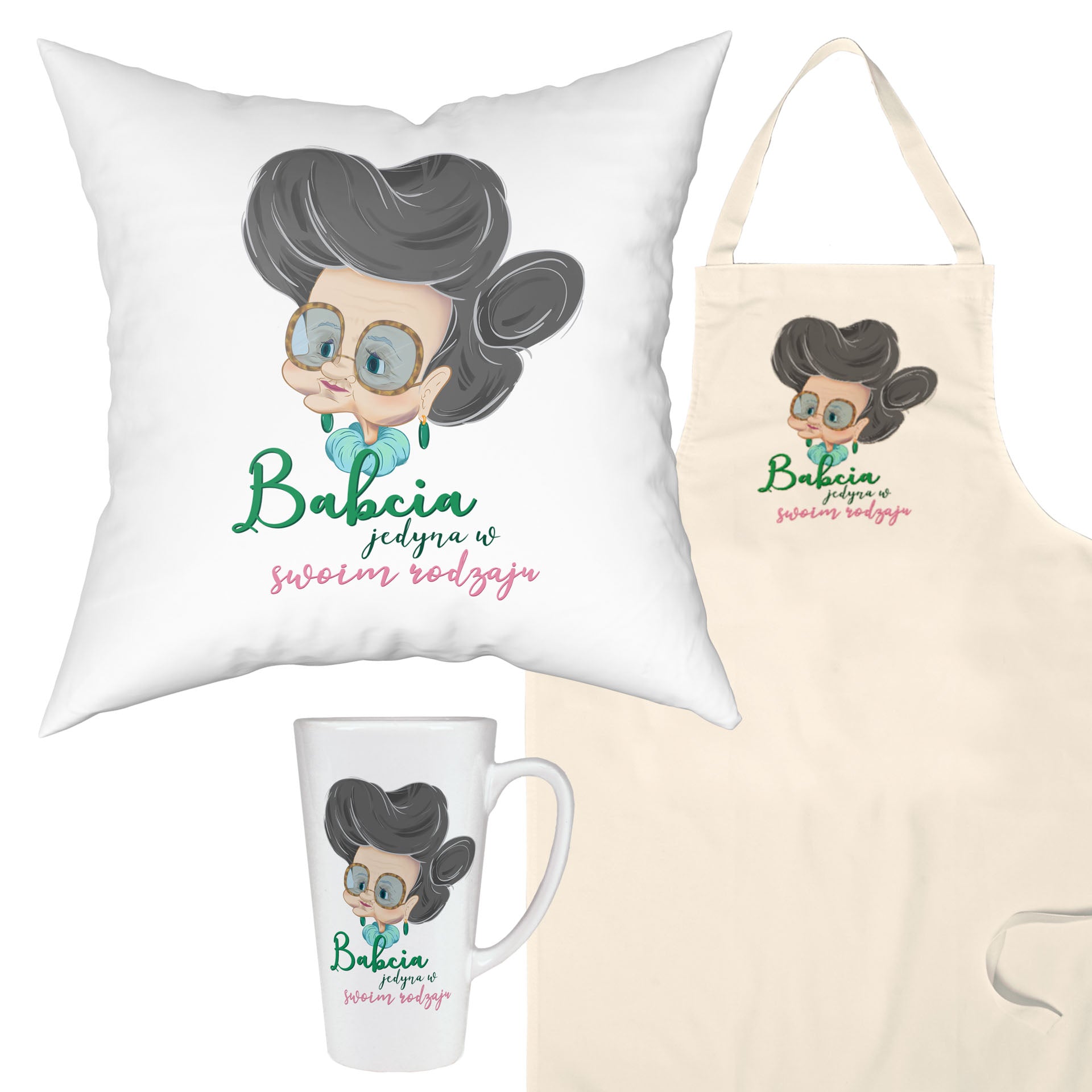 Zestaw Fartuch,Kubek,Poduszka Babcia Jedyna w swoim Rodzaju Prezent na Dzień Babci