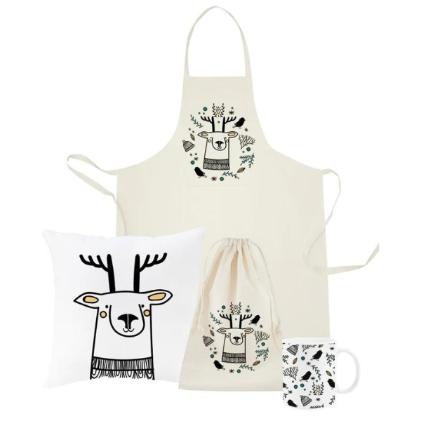 Zestaw prezentowy w postaci woreczka, kubka, poduszki oraz fartucha to wyjątkowy prezent na święta Bożego Narodzenia. Jest to produkt funkcjonalny, jak i ozdobny. Nada się idealnie jako podarunek dla najbliższych. Obdarowana osoba na pewno będzie zachwycona oryginalnym prezentem.